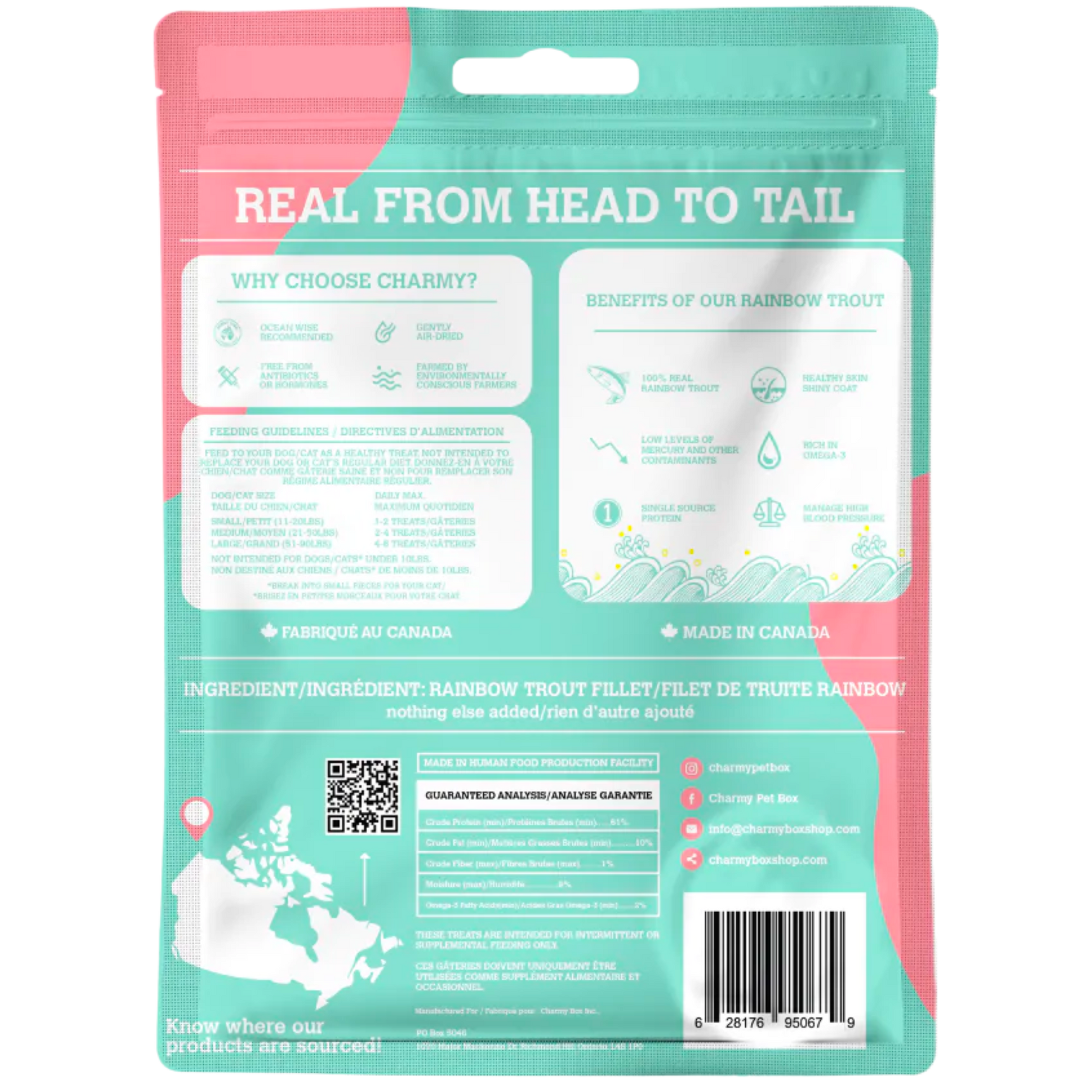 Nos gâteries de truites arc-en-ciel pour chiens sont réputées pour leur texture croquante et leur odeur de poisson. Elles sont coupées en morceaux carrés et séchées à l'air à basse température pour conserver un maximum de goût naturel. Ces friandises fournissent des nutriments essentiels aux muscles, aux articulations et au cerveau de votre chien.